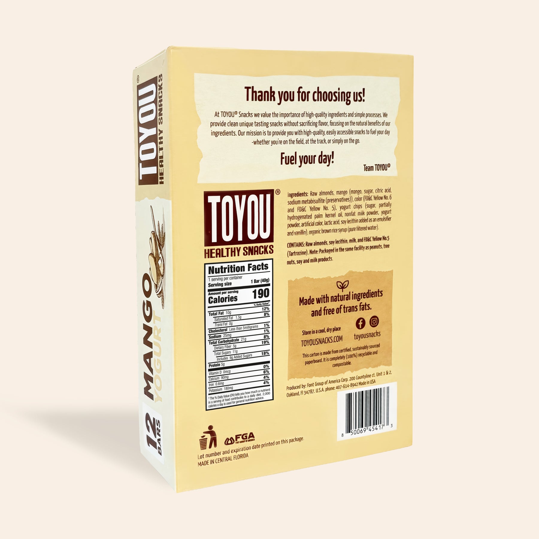 Ingredients: Raw almonds, mango (mango, sugar, citric acid, sodium metabisulfite (preservatives)), color (FD&C Yellow No. 6 and FD&C Yellow No. 5), yogurt chips (sugar, partially hydrogenated palm kernel oil, nonfat milk powder, yogurt powder, artificial color, lactic acid, soy lecithin added as an emulsifier and vanillin), organic brown rice syrup (pure filtered water).